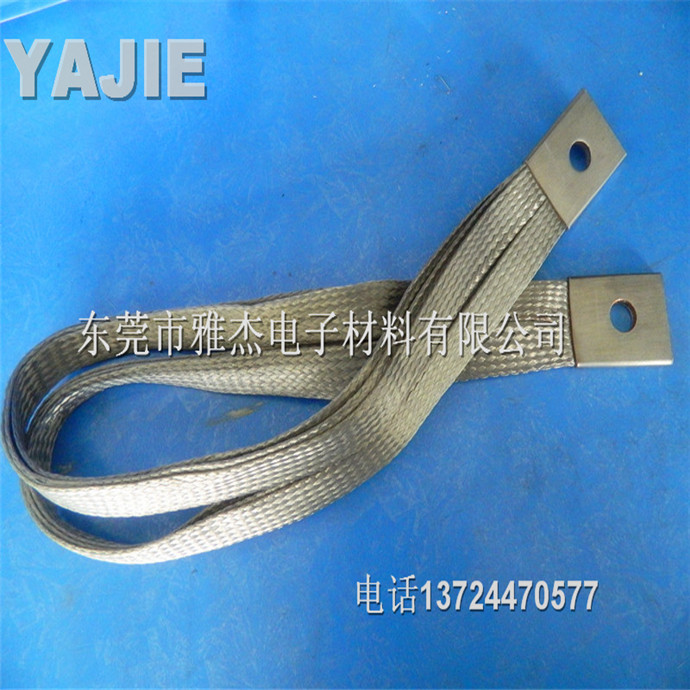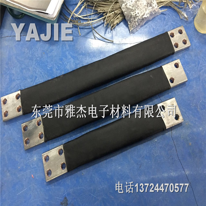 绝缘铜编织带软连接铜编织带软连接产品性能:用裸铜线、铜编织线,作为导体,两端采用铜端子,接头尺寸按客户要求生产,用冷压方法压制而成。可根据客户要求镀锡镀银。再通过特殊处理,做成高强度大电流软连接。导电率高、抗疲劳能力强。表面平整,光亮,接触面好,导电性能优越.适用性强, 柔软度佳,安装方便,易散热,耐弯曲,铜编织带是用无氧铜丝编织,线经0.10mm,0.12mm ,0.15mm单丝,根据客户要求,柔软度,通电强度等特制而成.广泛使用于高低压电器,真空电器,高低压开关柜,电焊机,汽车,电力机车,电炉,矿用防爆电器,发电机组,碳刷导线的软连接。东莞市雅杰电子材料有限公司采用***的原子扩散工艺,专业生产各种高低压电器设备用铜编织带软连接、铜母线软连接、母线伸缩节。铜带软连接广泛用于发电机、变压器、开关、母线槽、工业电炉、整流设备、电解冶炼设备、焊接设备及其他大电流设备中做柔性导电软连接。电流可达数万安培。