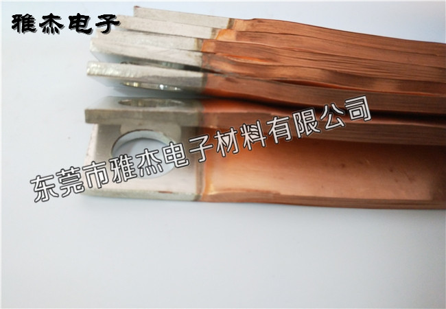 铜箔软连接又叫压焊软连接,铜皮软连接又叫钎焊软连接,压焊是将铜箔叠片部分压在一起,采用分子扩散焊,通过大电流加热压焊成型。钎焊是将铜箔叠片部分压在一起,采用银基钎焊料,与扁铜块对焊成型。铜箔:0.05mm至0.3mm厚。 接触面可按用户要求镀锡或镀银。东莞市雅杰电子材料有限公司早成立1995年,目前已成为国内专业的铜皮软连接厂家之一,公司经过十几年的快速发展,凝聚了一批具有丰富的设计、开发和管理经验的专业人才,拥有国内先进的软连接自动生产线、大功率专用焊机、全自动感应焊机及其它辅助设备,配备有一系列先进的专用检测设备;产品品质达到或超过国际同类产品质量水平。我公司生产的铜皮软连接规格齐全,品质有保障,价格合理,产品远销国内外!欢迎来电!